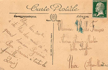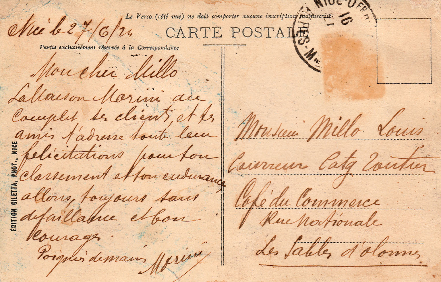 Carte postale de félicitations et d'encouragments adressée à Louis MILLO par son constructeur MORINI et ses amis niçois au cours du Tour de France 1924