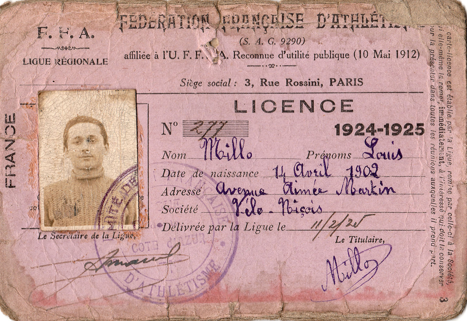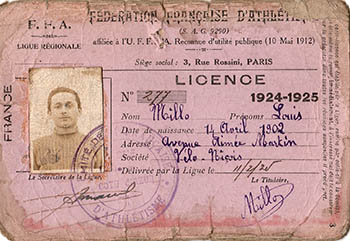 Licence de la Fédération Française d'Athlétisme accordée à Louis Millo pour la saison 1924-1925