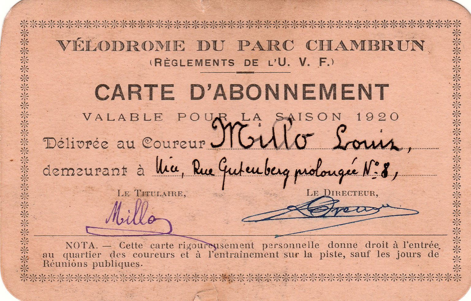 Vélodrome du Parc ChambrunCarte d'abonnement valable pour la saison 1920 au vélodrome du Parc Chambrun délivrée à Louis MILLO