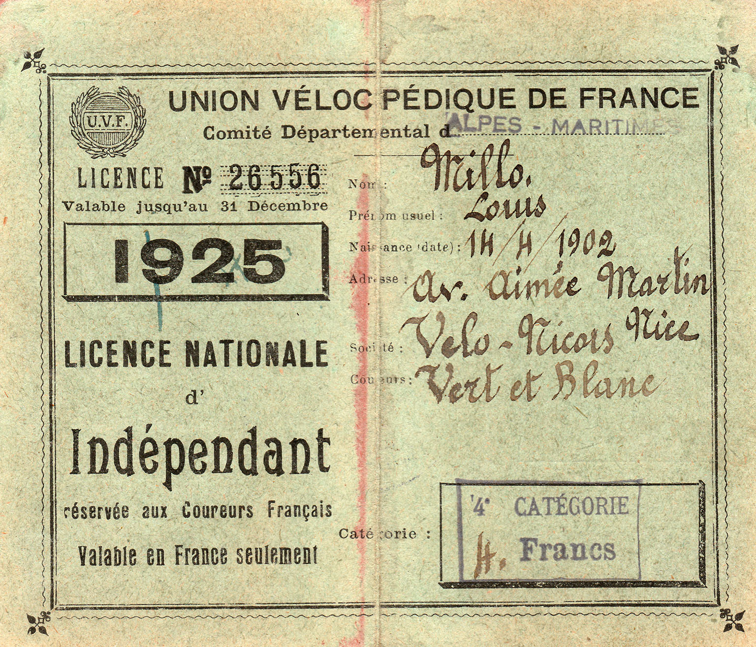 Licence Nationale d'Indépendant délivrée aux coureurs français valable pour la saison 1925 délivrée à Louis MILLO. 4ème catégorie, 4 Francs