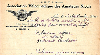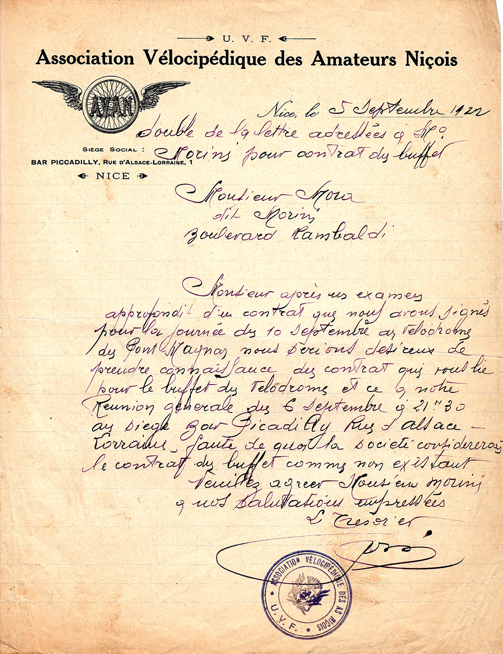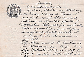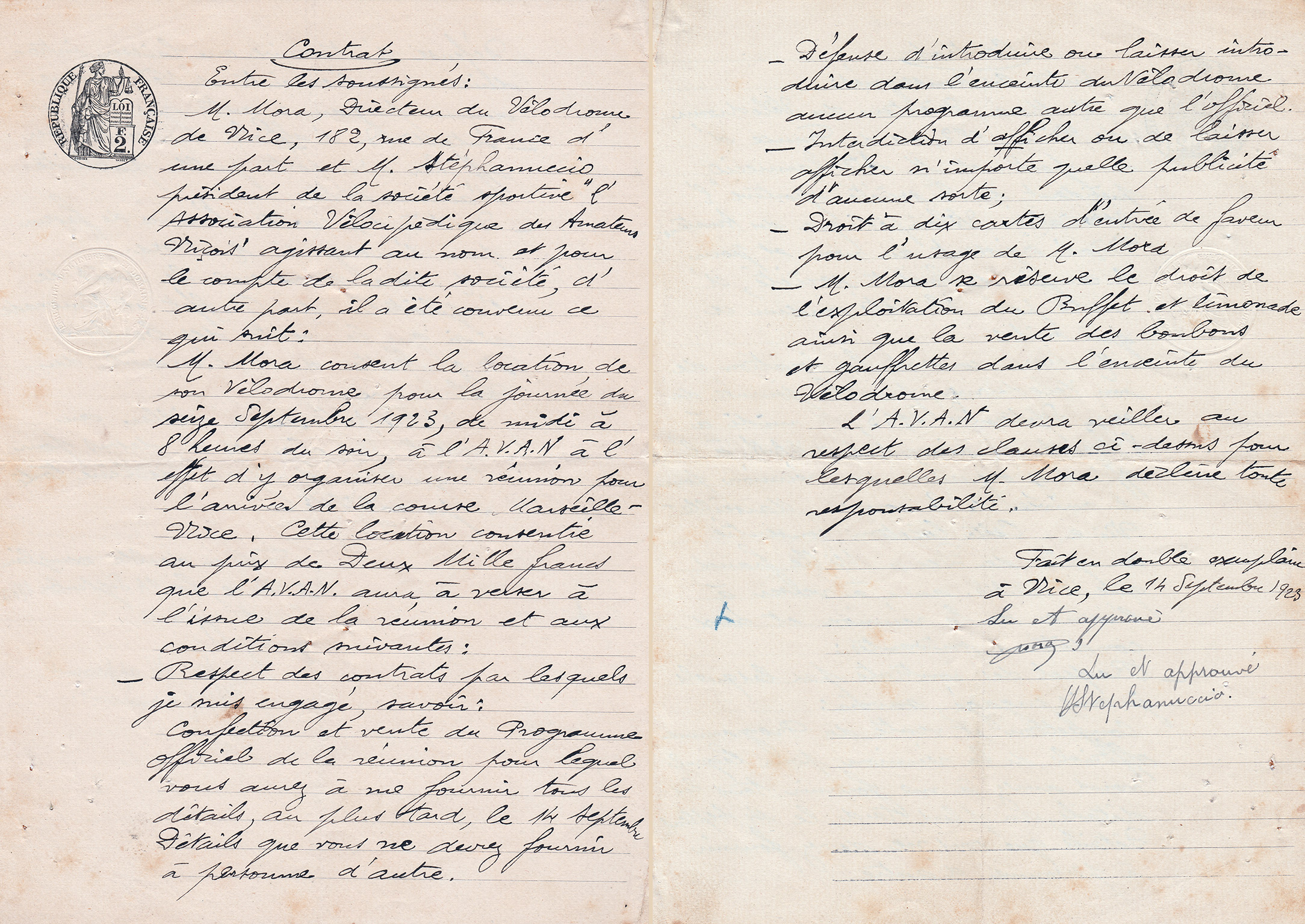 Contrat entre le Vélodrome du Pont Magnan et l'A.V.A.N. signé le 14 septembre 1923 par Mrs MORA et STEPHANUCCIO pour l'organisation de l'arrivée du Marseille-Nice le 16 septembre 1923
