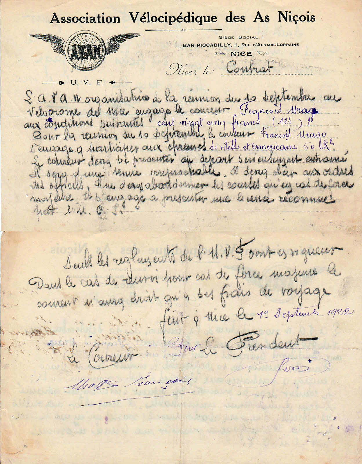 Les pistards sont engagés à contrat fixe. Ainsi François Urago signe un engagement avec l’Association Vélocipédique des Amateurs Niçois (qui sera celle des As Niçois pendant le second semestre 1921) de 125 Frs pour participer à la vitesse et à l’américaine de 50 km en Septembre 1922.