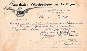 Contrat d'engagement de François URAGO pour des épreuves de vitesse et américaine 50 km, le 10 septembre 1922 au vélodrome de Nice