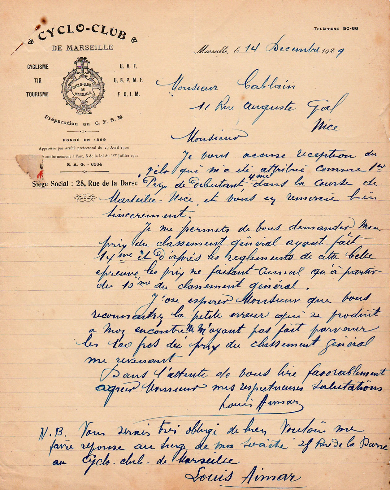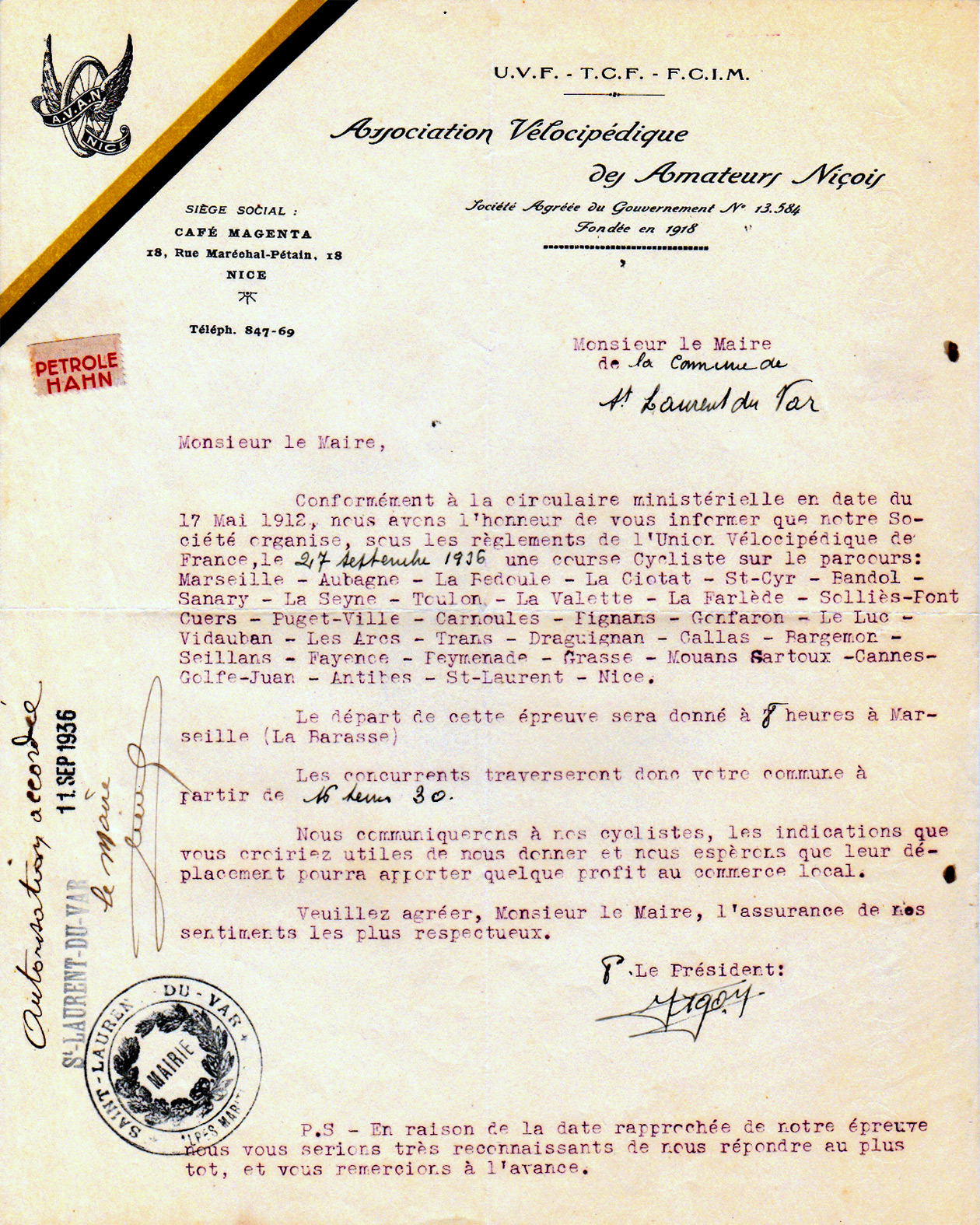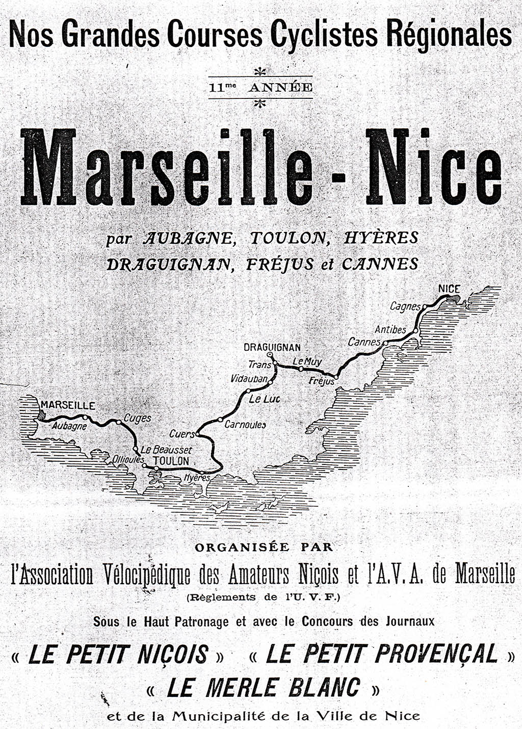Et nous ne terminerons pas sans féliciter, pour le magnifique succès obtenu par la course d'hier les dévoués et actifs dirigeants de l'A.VA.N. : MM. Stéphanuccio, président ; Cablain, directeur sportif, qui fut l'âme de l'organisation ; Glorio, Laïolo, Bourg, Bellone, Muratore, Vérola, Mussino, Bonifassi etc. ... auxquels nous devons joindre les dévoués de l'U.V.F. : MM. Marius Gola, président du Comité ; Girard président de l'A.V.A. Marseille, qui tint à suivre la course ; Toesca, représentant M. Debernardi, directeur de la Société Anonyme Francaise « Martini et Rossi », les sociétés des localités traversées, nos correspondants, les services de Gendarmerie et de Police, qui tous contribuèrent à ce succès.