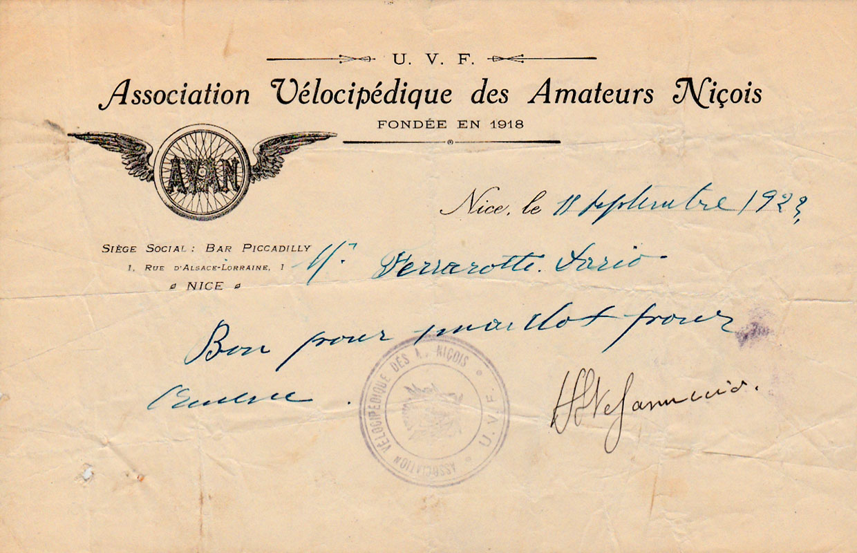 Bon pour un maillot signé par Honoré Stephanuccio - Marseille-Nice 1923