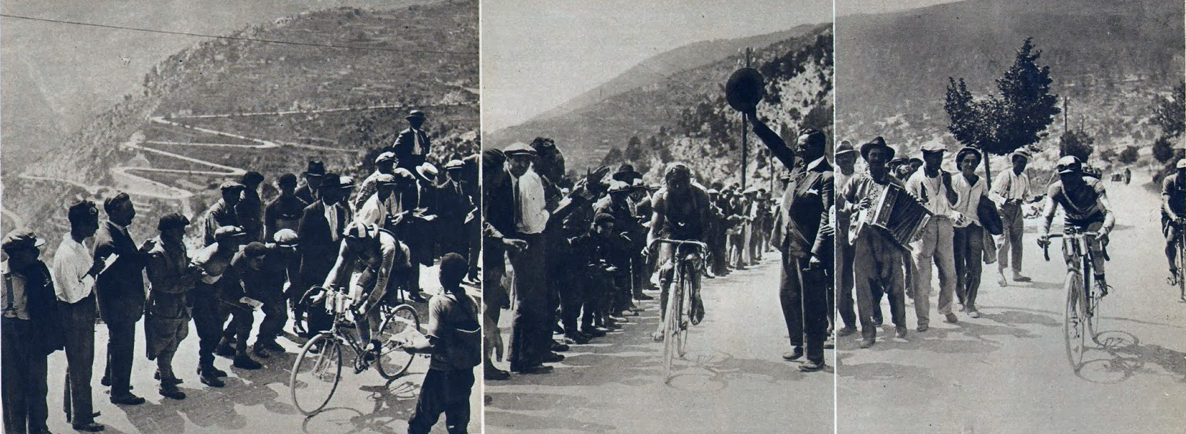 Image de droite : Un accordéoniste italien encourage Dewaele qui est suivi de Moineau