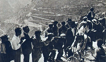 Jamais on ne vit tant de poussière, même pendant la traversée de la Crau, que dans la boucle de Sospel, littéralement envahie par voitures, motos, cyclistes et piétons. Vu d'un peu haut, le spectacle était même curieux. Une espèce de brume semblait flotter à quelques pieds au-dessus de la route. Dans une partie du parcours, relativement plat, après le col de Braus, nous trouvons le gars Moineau en train de casser la croûte.